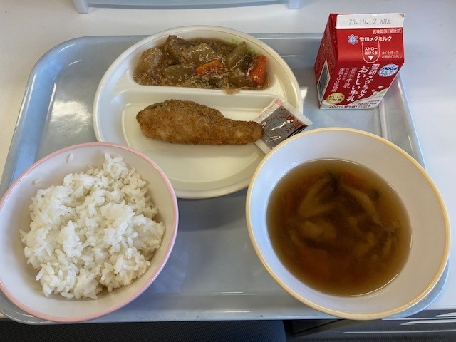 今日のスクールランチは、ごはん・北海道産真鱈のフライ(小袋ソース)・大根のそぼろあん・鶏ごぼう汁でした。ソースをつけて食べる正統派白身フライ、美味しかったです。最近、急に冷えてきました。風邪をひかないように、しょうがの効いた鶏ごぼう汁は予防に最適ですね。
