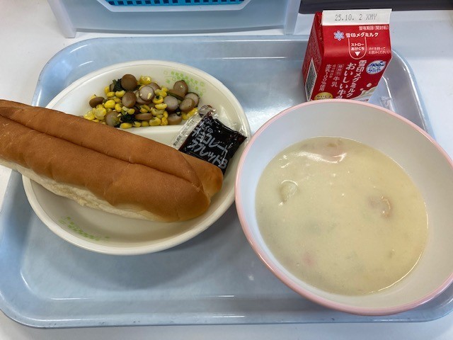 今日のスクールランチは、北海道産小麦のコッペパン・チョコレートスブレット・ウインナーとコーンのソテー・鶏肉のクリーム煮でした。いつも通りの香ばしい美味しいパンに、今日はチョコを挟んで食べました。みんな大喜びでした。鶏肉たっぷりのスープも美味しかったです。