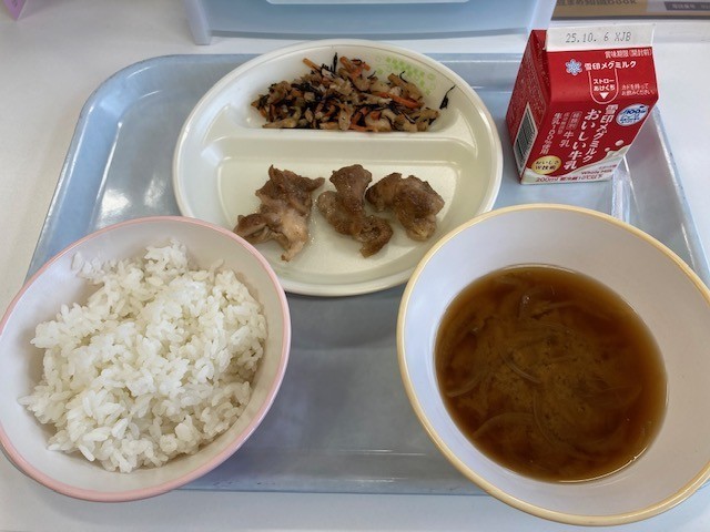 今日のスクールランチは、ごはん・鶏のごまタレ焼き・ひじきの炒め物・打ち豆汁でした。打ち豆汁は福井県の郷土料理だそうです。具が多くて美味しかったです。鶏のごまタレ焼きはとても柔らかく、ごまの風味でごはんが進みました。