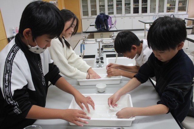 理科実験クラブは、紙に油で文字を書くと、あら不思議!水に浸しても破けないという実験!