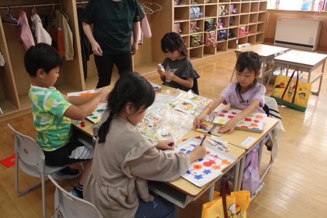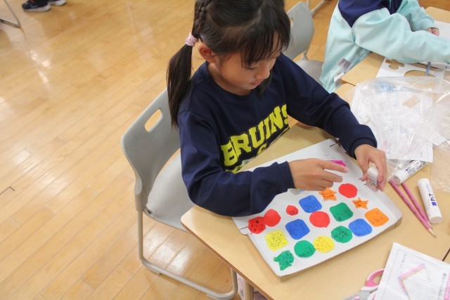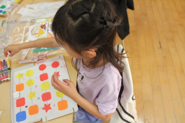 1年生のみんな、丸や四角や星形に切った折り紙に楽しいお話を考えて書き、すごろく作りに夢中!「てんしに会ったので3つすすむ」や「つかれたので一回休み」、そして「うさぎに会う」といった嬉しいできごとも。中には、ゴール目前で「犬においかけられて5つもどる」といったお話もあります。
