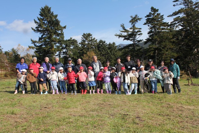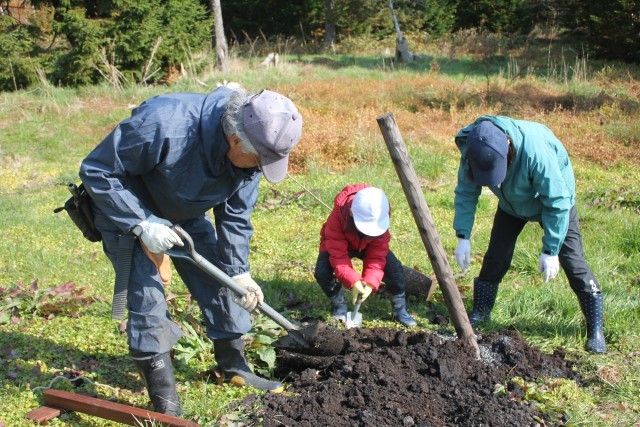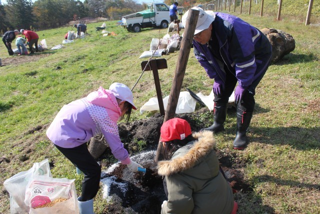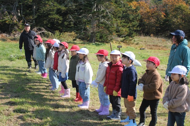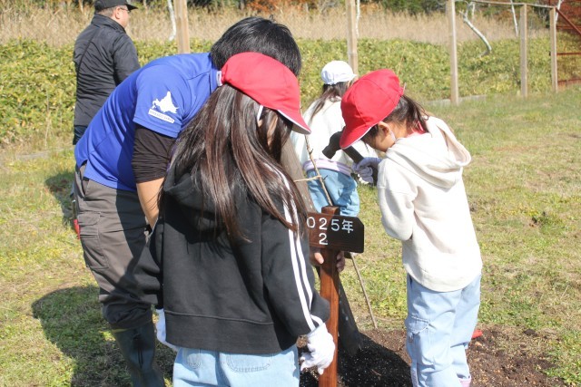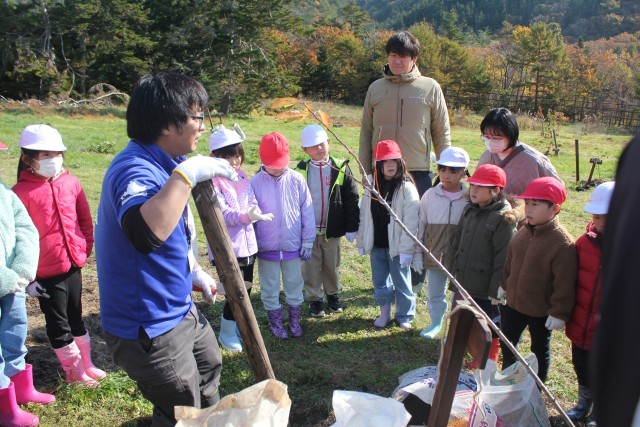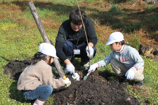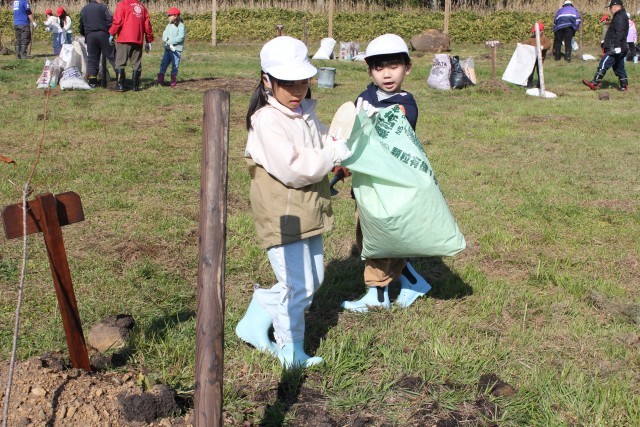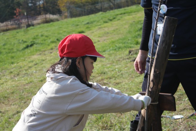 1年生のみんなバスで出かけ、現地に着いたら早速植え方を教わりました。肥料や炭、何種類かの土をよく混ぜ合わせて植え付けるということがわかりました。実際の植え付け作業には、推進委員会の方々が全面的に協力してくださり、各ペアに1名ずつが付き添い、子どもたちの安全面に気を配りながら見守ってくださいました。おかげで子どもたちは、安心して活動することができました。子どもたちがスコップでよく混ぜて、ふかふかになったお布団のような土に桜の苗を植え、支柱にひもでやさしく縛り、最後に植えた年と出席番号が書かれたプレートを立てました。これで、自分たちが植えた桜の木の成長を見守り続けることができます。いつか、大きく成長し、きれいに花を咲かせた桜の木を見に行けるといいですね。
