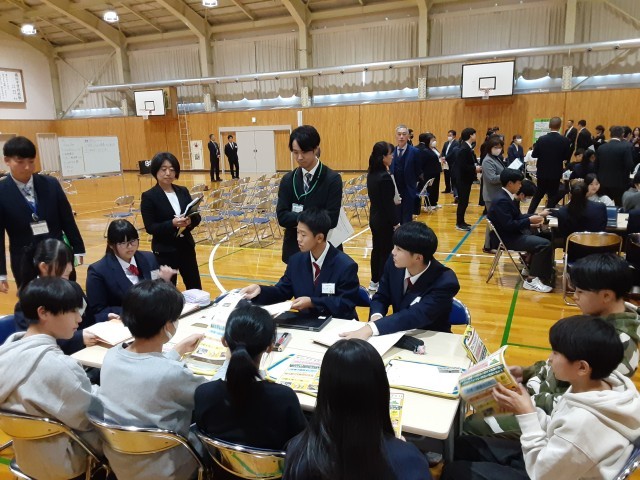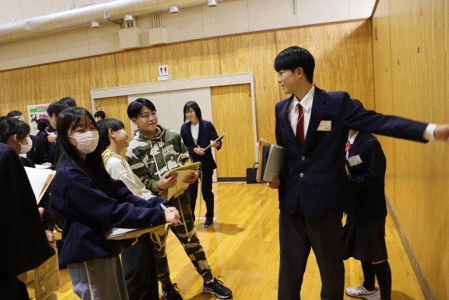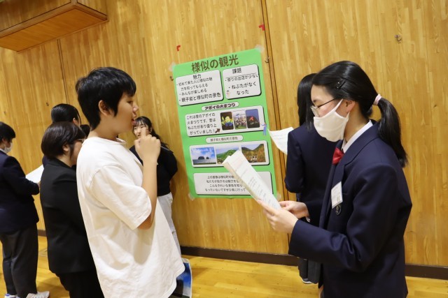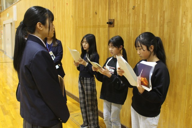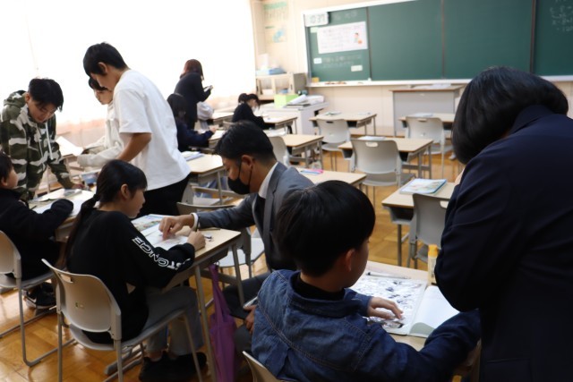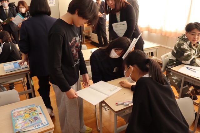 午後からは、総合的な学習の時間『ふるさとアポイ学』で6年生と中学校3年生が学び合う時間を公開しました。前回は6年生が中学生のポスターセッションを見て、発表のイメージをつかみました。今回は逆に6年生が作成したポスターを掲示し、発表を中学3年生に聞いてもらった上で、アドバイスをもらい、協力して修正作業を進めるという活動でした。中学生のアドバイスが的確で、ポイントを押さえた内容となっていたので、1時間の授業の中で6年生の発表がみるみるブラッシュアップされていくのを目の当たりにしました。6年生は中3生から教わったことをポスターに書き込んだり、シートにメモしたりして、しっかり自分のものにしていました。