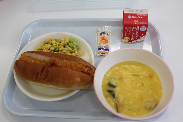 今日のメニューは、コッペパン・かぼちゃのシチュー・エビフライ・枝豆コーンごまドレサラダ・牛乳でした。エビフライはコッペパンにはさんでタルタルソースをかけ、エビフライドッグにしていただきました。ボリューム満点!おなかいっぱいになりました。ごちそうさまでした!!