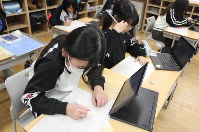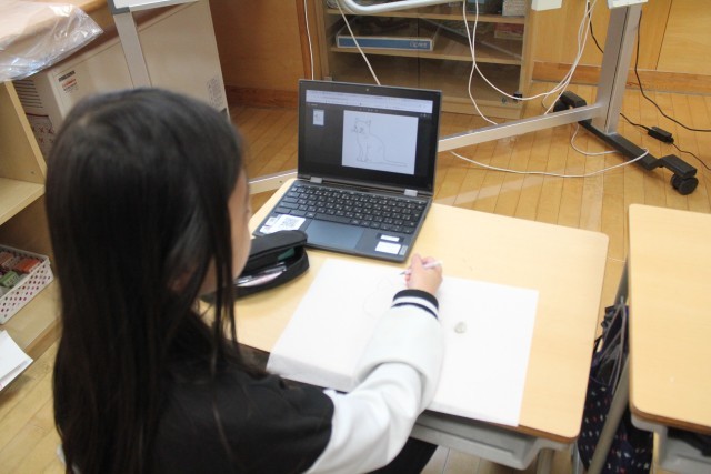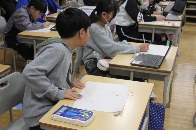 その1・2時間目となる昨日は、まず木版画に表したい動物を選び、版木に写すための下絵を描いているところでした。検索した画像を見たり、動物の姿を思い浮かべたりしながら、真剣に下絵制作に取り組んでいました。「もっと大きく描いた方がいいかなぁ」「スペースが余っているから、もう一匹描く」・・・と、完成したときのバランスも考えながら、好きな動物を描いていました。今年の干支の馬・ペンギン・ネコ・馬・シマエナガ・・・4年生教室にさまざまな動物たちが誕生しようとしていました。このあと、毛並みなども彫刻刀で表現するのでしょうね。彫り始めた頃にまた、見せてもらうのが楽しみです。