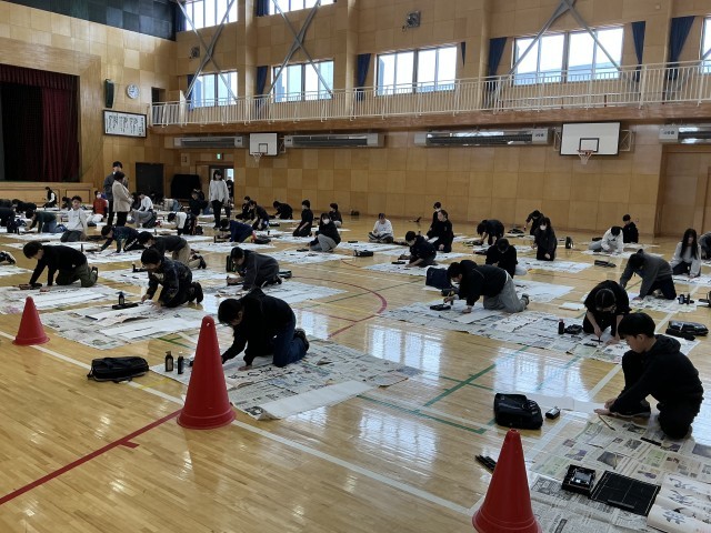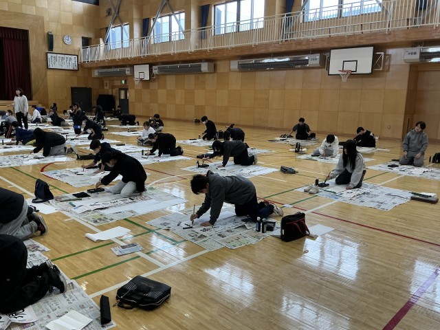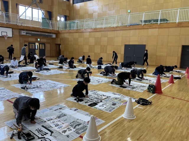 様似小学校でも4~6年生が一堂に会して、体育館で書き初めの席書大会を行いました。