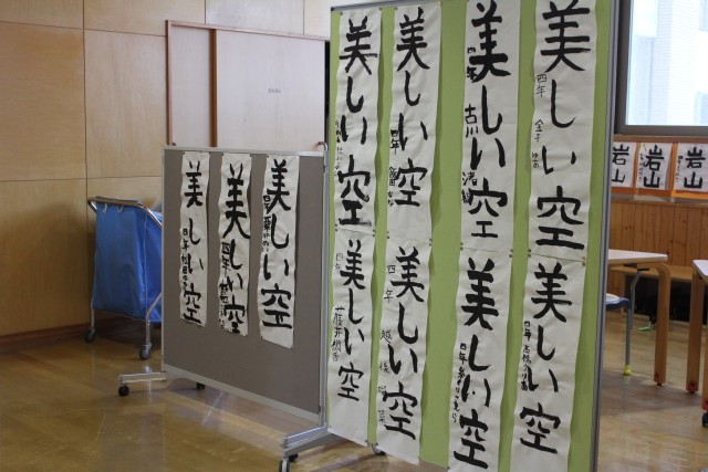 書写の教科書に載っているお手本に習いながら、4年生は『美しい空』、5年生は『世界の国』、6年生は『夢の実現』を書きました。