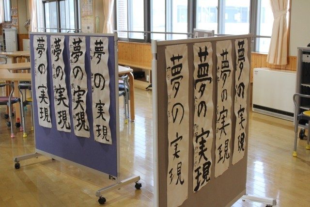 4・5・6年生といった高学年全員で取り組んだことで、縦割りの意識をもち、お互いの姿もお手本としながら、どの学年も集中して書き初めに取り組みました。力強く熱意のこもった作品が、2階のフリースペースにずらりと並んでいて、鑑賞しているだけで元気が湧いてきます。