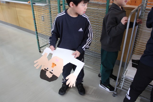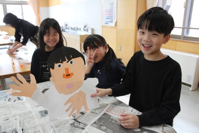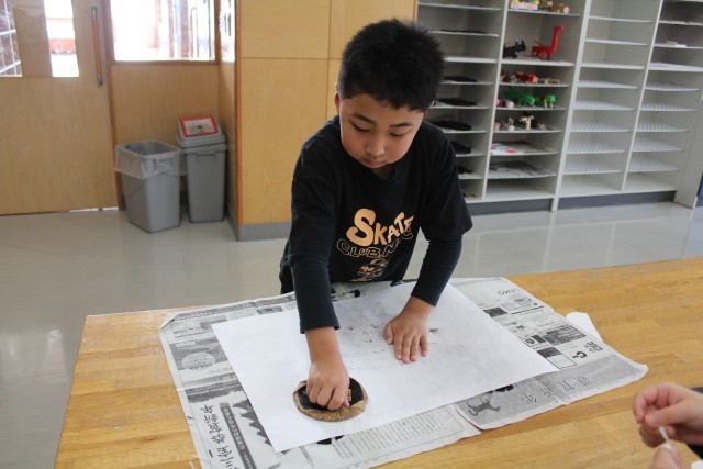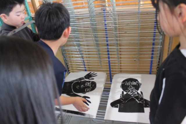 版画用具に十分慣れることもこの単元の目標ですので、バレンも上手に使って、版にのせたインクを紙に転写させていました。くるくると回転させながら、まんべんなく力をかけるのがポイントです。版のインクがしっかりと紙に転写されたことを確認したら、バレンを置き、用紙をめくります。版画は、この瞬間が一番の楽しみ!めくって自分の作品を見たときの子どもたちの感激した表情が、何ともたまりません。友だちと作品を見せ合いながら、「上手だね!」「いい顔だね!」「しっかり写ったね!」と感想を伝え合っている光景に、心が和みました。