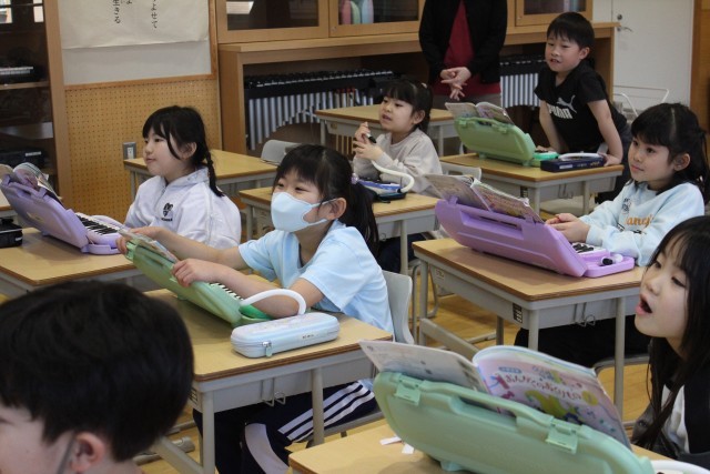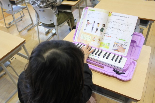 曲目は『すずめが ちゅん』 1番は「すずめが ちゅんちゅんちゅん おにわで ちゅんちゅんちゅん・・・」2番は「こぶたが ぶうぶうぶう・・・」という歌詞の楽しい歌です。この曲を鍵盤ハーモニカで演奏していました。