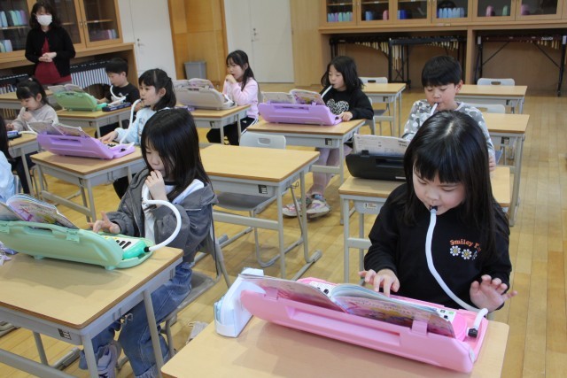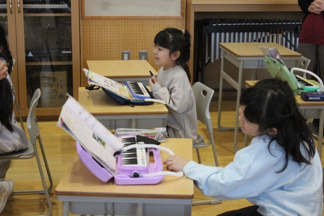 昨日の音楽室・・・1年生のみんなが、鍵盤ハーモニカの演奏に取り組んでいました。