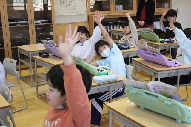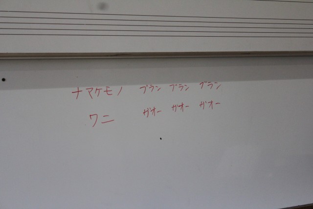 楽譜通りの音を奏でることができるようになったところで、1年生のみんなでアイデアを出し合って、他の動物の鳴き声や動きでも遊んでみようという課題に挑戦!