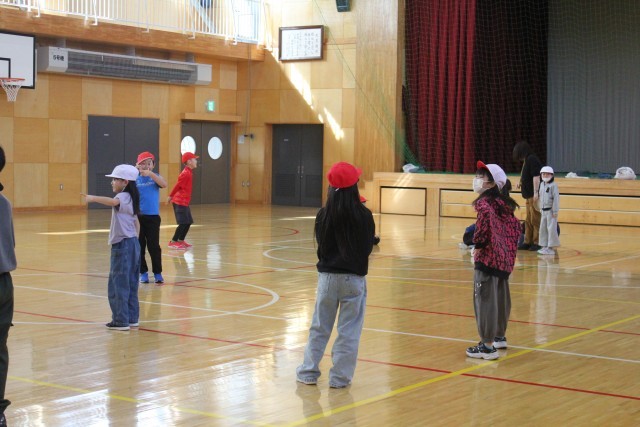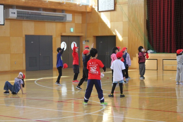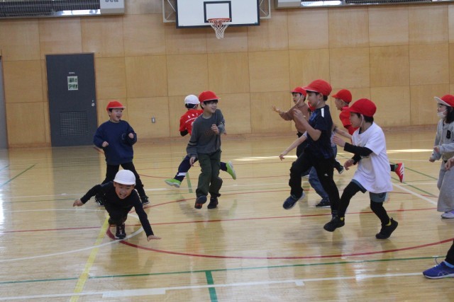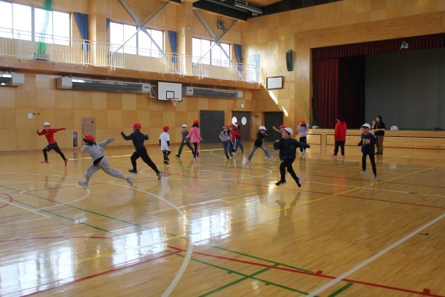 その準備運動として「○歩おに」で体育館いっぱいに体を動かしていました。