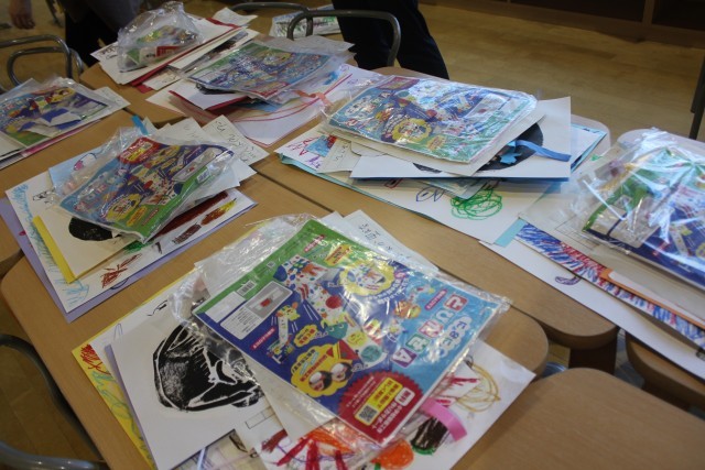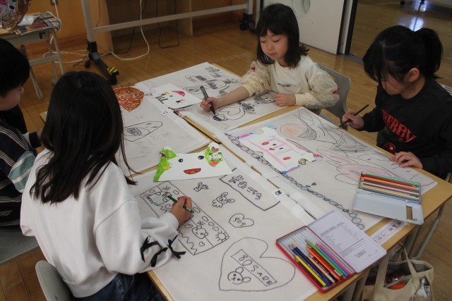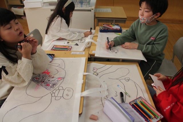 1年生は、最後の図工の時間、大きな白いバッグに好きな絵をいっぱい描いていました。