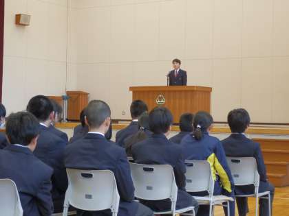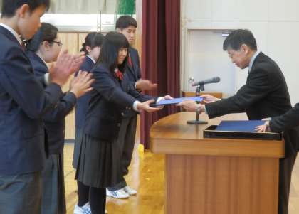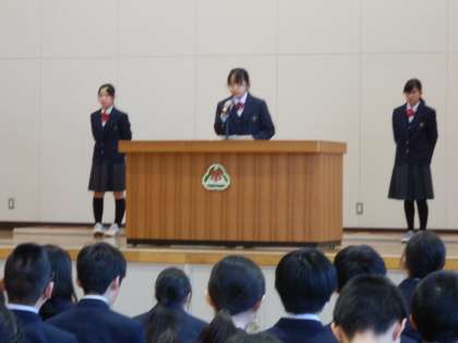 終業式では、生徒会長から2学期の振り返りが行われ、各学年代表からもさまざまな観点からの反省が述べられました。校長先生からは、冬休み・3学期に向けて励ましのメッセージが贈られました。