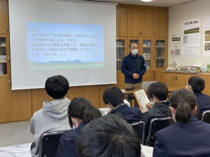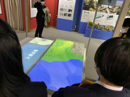 鹿追ジオパーク到着 公開日 2021/10/21 更新日 2021/10/21 2024年度 予定時間より少し早く鹿追ジオパークに到着しました。 時間に余裕ができたので、ジオパークスタッフの方のご協力によりプログラムを追加していただきました。プロジェクションマッピングによる鹿追町の成り立ちや鹿追町の特徴的な地質や生物について解説していただきました。