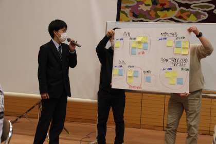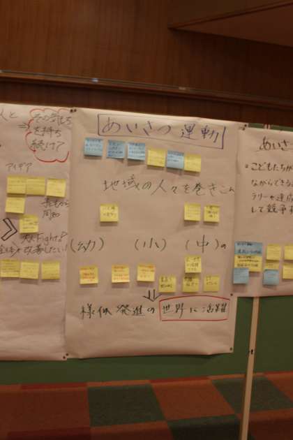 日渡堺市教育長をお招きして、様似町の町民の方々、役場職員、小中学校の教員など、多くの人々が集まり、活発な議論を交わしました。今回は「様似の子どもを”みんなで一緒に”育てよう」〜あいさつ週間及び登下校見守り活動の実施に向けて〜をテーマにして各グループで意見を模造紙にまとめ、発表しました。
