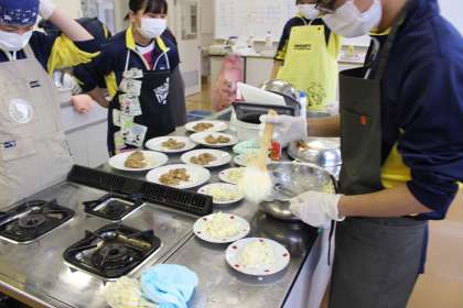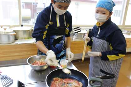 班ごとに分かれ、豚肉しょうが焼きとポテトサラダを作りました。生徒たちはそれぞれの役割を決め、協力して調理していました。中には「時間が足りなかった」といった声もあり、手際よく調理することの大事さを学べたと思います。最後に、完成した料理をみんなで美味しく食べました。