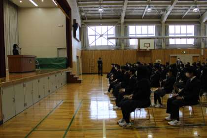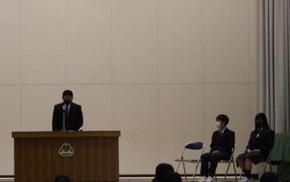 生徒たちは久しぶりの登校で、友達と楽しく元気に過ごしていました。1時間目の全校集会では、校長先生のお話の後、生徒会長や各学年代表から冬休みの振り返りとこれからの抱負が述べられました。