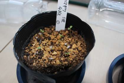 自分の班の鉢植えを観察して、土が乾いている様なら、水をかけてあげます。そして、記録シートに観察したことを記入しました。すでに芽が出ているところもありました。