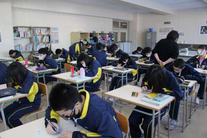 2月8日(火)の2時間目、美術の時間で1年生がゼンタングルを描きました。