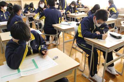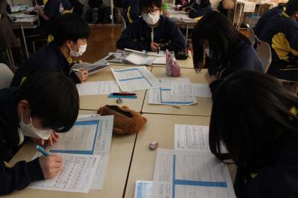 3月3日(木)、4日(金)の後期期末テストの範囲表が配られ、計画表にテストの目標や勉強の予定を書き込みました。ここまで3回の中間・期末テストを受けた経験を活かして、自分に合った計画を立てられたようです。
