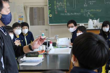 今日の理科ではモーターと発電機の仕組みについて学習しました。フレミング左手の法則を使って、モーターの中のコイルがどんな力を受けるか真剣に調べていました。先生から乾電池と磁石とエナメル線などで作った簡易モーターが高速で回転するのを見て,生徒たちは驚いていました。また、身近なスマートフォンなどにも学習したモーターが使われていることなどを知り、興味をもって学習していました。