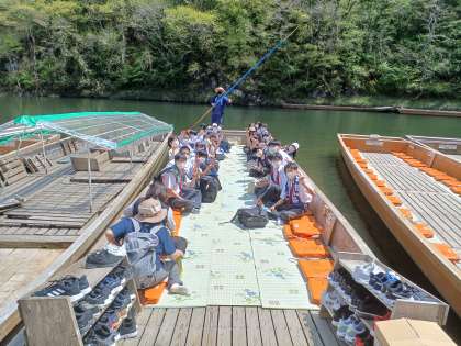 マイナスイオンをたくさん浴びて、断崖絶壁の渓谷を優雅に舟下りをしました。途中、銭投げや川魚へのエサやりを楽しみました。上流の船着き場では、運玉投げで盛り上がりました!