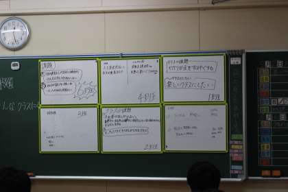 クラスの課題としては、「積極性がない」、「切り替えができない」という課題が出ていました。また、こんなクラスにしたいという思いとしては、「明るい」、「仲がいい」、「楽しい」、「元気にあいさつができる」といった意見が出ていました。