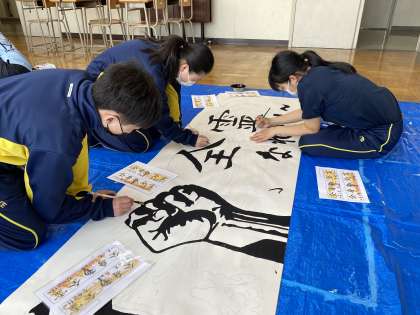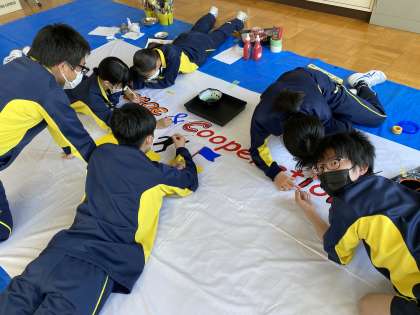 横断幕には、3年生は『Only one×30』、2年生は『戮力協心』1年生は『全身全霊〜もっと熱くなれよ〜』の学級スローガンがデザインされています。また、生徒会書記局は今年度の生徒会テーマである『Challenge & Cooperation』をもとにシンボルマークの製作も行っています。体育大会まであと1週間。各種目の練習とともに、制作物の取組も順調に進んでいます。