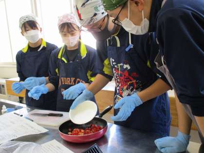 2年生の家庭科では、いちごジャムを作る調理実習を行いました。いちごは様似町産を使用して、作ったいちごジャムをパンに塗ったり、ヨーグルトに混ぜたりして食べていました。