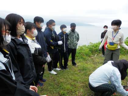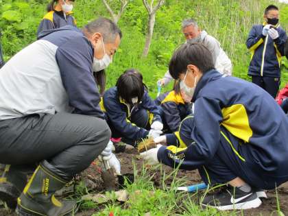 3・4時間目には、育ててきた高山植物の苗を再生実験地に植える活動が、アポイファンクラブの方の協力のもとに行われました。今まで種から育ててきた苗を傷つけないよう、優しく丁寧に植えていました。