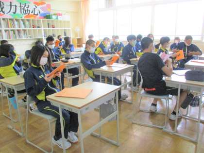 7月13日(水曜日)の6時間目に、宿泊研修の結団式と最終確認が行われました。結団式では、実行委員長のあいさつや宿泊研修の目的・きまりの確認を行いました。また、宿泊研修の最終確認では、1日の流れや持ち物、記録係の使うカメラの確認を行いました。