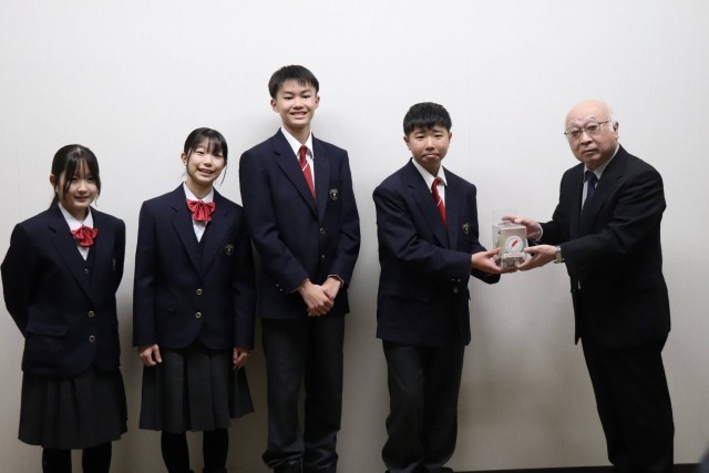 生徒会書記局は、この度集まった募金を町の社会福祉協議会に贈呈しました。みんなの協力により集まったお金はなんと11,872円です。学校を代表して生徒会4名が常務理事さんに直接手渡しすることができました。生徒会長は「困っている人が少しでも幸せになれるように役立ててください。」と話しました。こちらの募金は、来年度の福祉施設や災害復旧などの費用に使われるそうです。こうしてみんなの善意が形となってあらわれるのは素敵なことですね。協力してくれた皆さんありがとうございました。