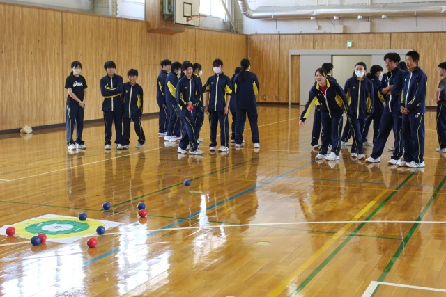 今日から3日間の昼休みを使って生徒会主催のボッチャ大会を行います。今日は1年生対3年生でした。これは、みんなでボッチャを楽しもうと生徒会が企画し、各学年が4チームに分かれ協力しながら進めました。1年生は先輩方に先日やり方を教わったので今日は上手に投げていましたが、さすがは3年生!戦略も考えながら的に向かって上手に近づけていました。結果は3年生が大差で勝ちましたが、どの学年も盛り上がって終わりました。明日は2年生対3年生、明後日は1年生対2年生で対戦します。